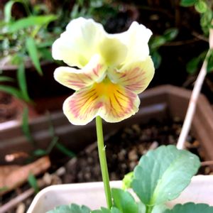 夜分遅くにこんばんは♪ 春に蒔いた、パンジーさん… 本日開花です♡ でもね、お花さんがビオラさん的に 小さい😓 たくさん蒔いたのですが、この子だけ。 咲いてくれてありがとう😊♡