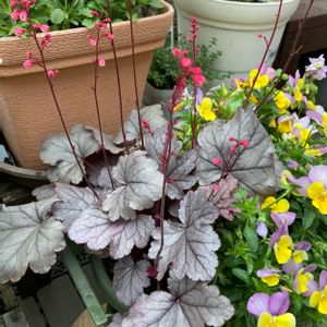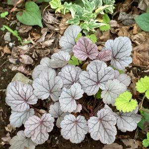 ヒューケラ・ドルチェ・シルバーガムドロップ 購入したときは紅葉していたので、 シルバーの葉色が見れて嬉しいです♫ 庭植えにしたいのですが、 あいにくの雨続きでなかなかタイミングがあいません(◞‸◟)