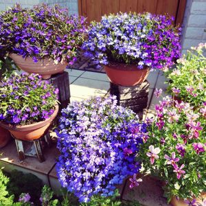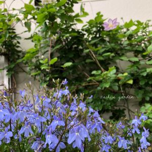 おはようございます☀️ 我が家の西側スペース✨✨ 鉢植えのロベリアが満開です💙 後方のクレマチスもポツポツ咲き出しました💜 今日も素敵な一日をお過ごしください😊