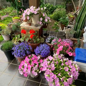 昨夜から雨☔️、ペチュニア(さくらさくら、桃色吐息)とロベリアを軒下に避難させました。 避難出来ない外組さんごめんなさい🙇