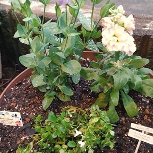 今日お迎えした苗から…🍀 奥左…トルコキキョウ(ブルー) 奥右…ベビーストック(クリーム) 手前…ロベリア(ホワイト&ブルー) ロベリアは以前から育てていて、お隣さんがずいぶん前から不在なってしまっていたので、有効利用ということで…😆 だいぶほったらかしだったので、少し弱りぎみなのとボサボサだったので切り戻しました✂️✂️ トルコキキョウは、前から見ていて可憐な雰囲気でいつか育ててみたいなぁと思っていて、今日たまたま小さめサイズの寄せ植え向きのものを見つけたので迷わずお迎えしました🎶🎶 ストックは、正直まだこの時期は細くて頼りないストックしか出回らないと思っていたのですが、小さめサイズながら、がっしりしていて程よく分枝してるものがあったのでこれは長い間咲いてくれるかなという期待を込めて買ってみました😆✌️ ストックの香りが好きなんですよね~🤩 色によって多少香りが違うように感じるんですが、どうなんでしょう🤔🤔 僕の怪しい予想によると、全部それなりに咲いてくれたら、少し爽やかでいて華やかな香りを感じる仕上がりになるはずです😅🍀