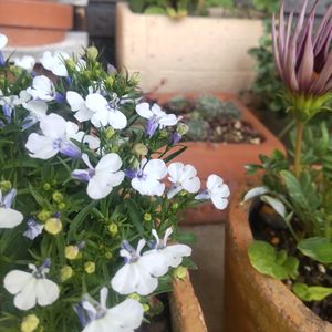 こぼれ種から発芽して雑草?と思いながらもパンビオの寄せ植えに植えてたあの子😅 ロベリアブルースプラッシュが可愛く咲いてくれました😂 白に少しだけブルーが入っていて可愛い🤍💙