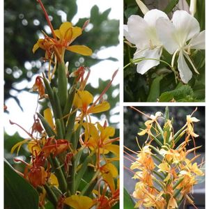 おはようございます😃 ジンジャー リリー 黄色と白 左 キバナシュクシャ 昨日 シベがモシャモシャ 長く伸びた雌しべ 参考に 右下 数年前に撮った姿 同じ場所です 右上 ハナシュクシャ(白)