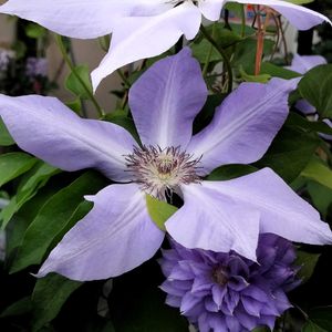 雨の土曜日☔ 日本の色のイメージの藤色💜 すみれ色より淡く、うすむらさき色が好きだわ🎵 ご近所で出会ったクレマチスとジャーマンアイリスの 素敵な色に魅了されました✨💍✨🎶💜
