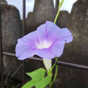 雨上がりのブルームーンさんです。 丸弁でおおらかに咲きます。 新苗と大苗の区別を知らないころに新苗でお迎えして4年目を迎えました。 いまや2m近いところで花を咲かせています。