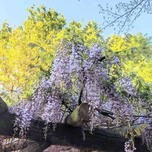 藤の花 ご近所の藤です。 漸く満開になったかな?🤔 昨日の雨で花びらが少し落ちていました。 我が家の鉢植えの藤は今年咲きませんでした。😅 去年は咲いたのに何故かしら…🤔