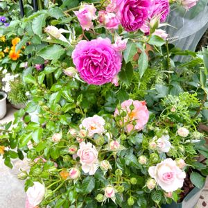 シェエラザードさんが房で咲き、足元のコルデスのミニバラ、ピーチドリフトも続々と開花を迎えました!