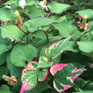 💕今日のお花達・🅱️💕 シングルの斑入りドクダミ❣️😊 2022年6月19日撮影しました😊oki 国立市内散歩中🚶♀️🚶🚶♂️に花友さんの お庭で以前から気になった斑入りのドクダミです😊 昨日お宅に訪問して! "撮影会開始!スタート‼︎" 昨年ドクダミの葉が、花後に緑から! 赤茶色の柄模様に変化が素敵ですよ〜😊 と報告しました😊 今年!斑入りのドクダミの葉に出会い! 目👀が点に成りました❣️😊 花友さんに質問しました! 何故この様に変化するの…? 園芸品種…? 花友さん!自然に咲いている ドクダミですよ‼︎ 庭の土が酸性土壌で、赤い斑入りの 葉に成るのかな? 毎年赤色の斑入りの葉が出ると! 下から(後から)出て来る普通の葉を 引き抜いているとか… どんどん増えて5mぐらいの花壇が 斑入りのドクダミで素敵です💕😊 行き交う人達が斑入りのドクダミを 見て感動して下さるとの事です💕😊 私も大感動です😊 皆様もご覧下さい♪♬🎶😊 最近の投稿画像を検索して! 園芸店には、園芸品種で‼︎ 「ゴシキドクダミ・カメレオン」 の別名で販売されているそうです‼︎