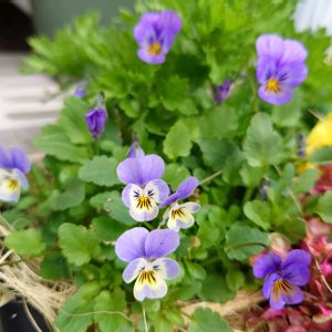 こんにちは☀ ①極小輪ビオラのフィーリー🎵 地元の花農家さんで育ってた苗です😃 ②村岡オーガニックさんのビオラ ジョリージョリ🎵 小輪系は花付きガいいですね😊