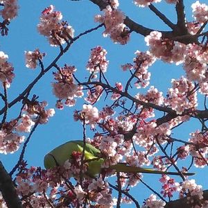 一気に咲いた河津桜🌸を、野生化したインコが次々にむしって下に落としていました😱🐦何故??食べられないのが口惜しいの? 近年野生化したインコの群れの害が問題になっているようです😆