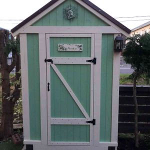 去年私が デザインして作った 小屋 小屋に付いている お花も 私が廃材使って 書いて 付けてあげたら とても喜んで頂きました😊