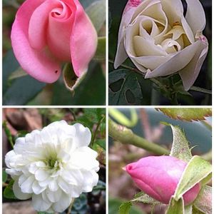 🍀バラ🍀 今年の秋バラは あまりにも小さくてミニバラのよう。 おまけに花数も少ないし葉っぱも少ない。😅😅😭😭 一つでは力不足なのでコラボで助け合ってもらいました。☺️ 左上 ピンクサクリーナ 左下 ミニアイスバーグ 右上下 不明 🏷水曜ローズショウに参加させて下さいね。