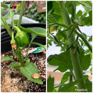ちいさなピーマンと 真珠サイズのトマト発見🍅 小さな幸せを見つけた感じで嬉しくなりました。無事に育って欲しいな。