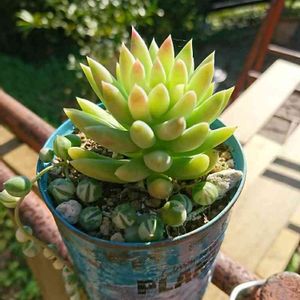 おはようございます。 ダイソーの缶に 多肉ちゃん「樹氷」 植えました。