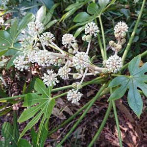 🌸ヤツデ🌸 今の時期に咲く白い花! 日陰大好き! 常緑で大きくなる! 天狗の葉団扇ともいわれる! なるほど、天狗様が持ってるね! 葉の葉脈が8本かと思ってたら、7ー11本! 8は、沢山の意味だって! そんなこんなで庭の隅で大きくなってます😅