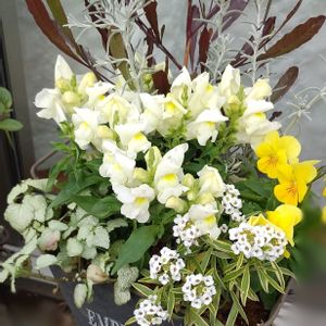 おはようございます 八重咲き金魚草 ドドナエア スーパーアリッサム ビオラなどの寄せ植えです。