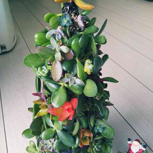 先日、どなたかが、ツリー型の寄せ植えされていたので、やってみたくなった。 一週間かけて、土台づくり。頑張って40cm! でも、寄せる多肉が少なすぎで、スカスカ。😂 そこで、巨大化した金のなる木の、先っぽをカット🌠😲😉😂✂ 金のなる木が大き過ぎてバランス悪😨 難しい~ でも、挑戦出来て、良かった😉😄😁