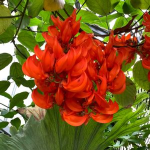 🍌熱川バナナワニ園🐊にて ❤️オウムカズラ❤️(ムクナ・ベネッティ–) マメ科 トビカズラ属 一番上の8号温室で咲いてました 2週間ぐらい咲いているようです、まだ小さな蕾もありました 11/3(水) オオオニバスの開花を待っている時 ベンチの上で見つけました 翡翠カズラ(豆科ヒスイカズラ属)に似た形のお花です。 ヒスイカズラ(青緑色)とは対照的に鮮やかな緋赤オレンジ色が綺麗です。