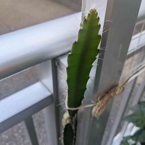 全長110cmほどに育った実生ピタヤ 固定できる支柱がないので、ベランダの物干し竿に縛った しかしこんなところで冬越し出来るのだろうか、、、 どうせ根元が細いし胴切りして屋内で冬越しするかも