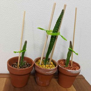 このドラゴン🌵は10cmくらいかな 支柱が歪んでるから、このあと指し直した 多分、土の中で根が支柱を歪めてるんだろね