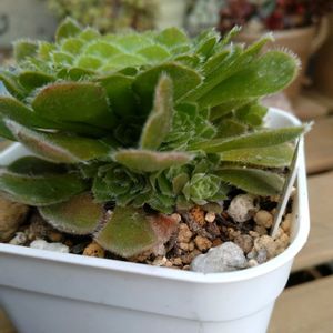 エケベリア ロマン。 日本海沿岸部、冬の日照不足で紅葉が若干、褪せました…😞 ですが、再び子株が3つも増えた。春の植え替え時期に2つと計5つも増えました。 このロマンは葉挿しもしてみたけど育ちませんでした。子吹きで増えるタイプです。 奥の方に新しい子株がムギューっと狭い中耐えています。 次の春に植え替え、株分けするのが楽しみです♪