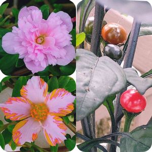 おはようございます🖐️😃☀️ →ブラックパールサンに赤い実が付いていたのでパシャ👀📷️✨ 後ろに違う色の実もあり👀‼️ 緑っぽい実、オレンジ🍊っぽい実、茄子🍆色の実、黒だけでなくて楽しませてくれます😆⤴️💓 ↖️↙️はHCでお値下げされていた変わり咲きポーチュラカサン😍 ↖️の桜みたいな子をお迎えしたかったのですが、ミックス植えでしたから↙️の子ももれなく付いてきました😃 よーく見ると↙️の子も素敵でした😆⤴️💓