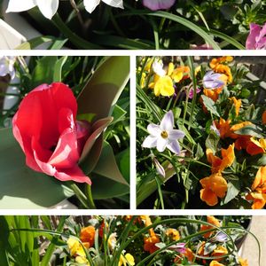 球根類寄せ植え アネモネ チューリップ ムスカリ アイフェイオン が植えてあります。 今年4年目のアネモネはどの鉢も紫と青ばかり出てきています。赤と白の気配が全くありません😅 赤と白は全部処分した球根の方に入っていた可能性も…。