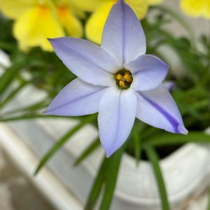 ✾ハナニラ✾ 昨日、日が暮れてから、和歌山に着いたので、今朝、お花の見回りを♫ あっ❣️ 一つ咲いてる♫ 綺麗なブルー💙のお花が見える♪♪♪ 待ってたのよね〜(*´∀`)ウレシイ♪ 昨年の秋頃に、チューリップの球根などと一緒に植えたもの。 ニラと同じ細長〜い葉が何本も伸びていたから、もうすぐかなぁ〜と、和歌山に来る度に楽しみに覗いていた🕵♀ 星形☆の青紫色が期待以上に綺麗✨✨✨ 私は、チューリップと寄せ植えしたけど、 もっと濃い青色のムスカリと寄せ植えした写真を見て、そのグラデーションもいいなぁ〜🎶と思った♫