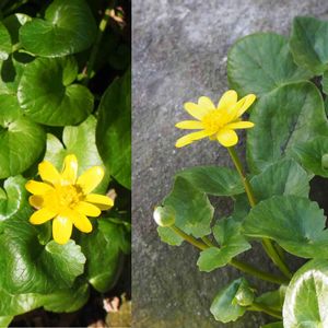 「水辺の水曜日」 水辺に居た黄色いお花、葉っぱは丸っこく光沢が有ります。 開花時期からみて、ヒメリュウキンカでしょうか? まん丸の蕾も可愛いです。 リュウキンカ(立金花)はキンポウゲ科リュウキンカ属の多年草。 水辺や湿地。5〜7月に開花 ヒメリュウキンカ(姫立金花)はキンポウゲ科キンポウゲ属(ラナンキュラス属)の多年草。 日本のリュウキンカは湿地や川べりに生育するのだが、これは普通の土壌でも育つ。 欧州金鳳花(オウシュウキンポウゲ)として表示するところもある。 3〜5月に開花。