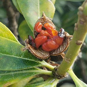 ⏪️前picをアップで🔴トベラの赤い種子🔴 トベラの実が、三つに裂けて真っ赤なネバネバの種が見えます🔴🔴 調べたら🔍 実の中には粘着質の赤い種子が詰まっていて、無味無臭で美味しくないそうです🙅 ヒヨドリなどが食べることがありますが、無味無臭のためにあまり好んで食べられることはないので、鳥の餌となって運ばれることよりも、その粘着性を活かして鳥の体にくっつき、種子を遠方に運んでもらう事の方が多い…と記載されてました