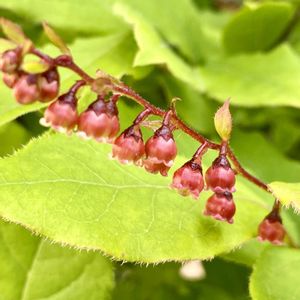 ①ナツハゼさんのお花可愛いです♡ ②花後の実も膨らみ始めました📍📍📍📍📍📍📍📍📍🎶 ③葉っぱ🌿は秋にピンク色になりますね🩷 ④⑤柿のお花も小さな実になり始めました💚 無事に大きくなります様に