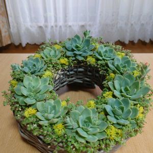 多肉のリース 山梨のメイのしっぽさんでくるみさんのWSに参加しました セダムのちまちまが苦手で💦くるみさんの神の手をお借りして完成🤭