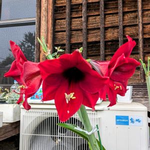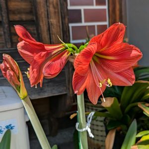 アマリリス、咲き始めました。 6本の花茎のうち、1本だけですが。 残りの5本も、もうすぐ咲きそうです。