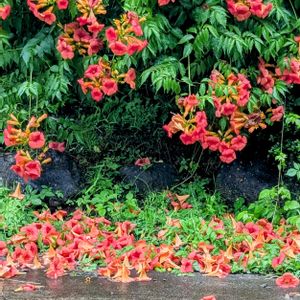 笠間市は、朝から雨。 たくさん咲いてたノウゼンカズラ、悲しいかなけっこう落ちてしまいました。
