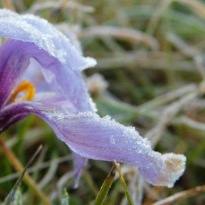 サフラン 霜の華に花びらも凍る 昨日のうちに紅い雄しべは摘み取りました。 寒い今朝です。