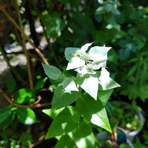 マウンテンミント 地下茎でアチコチから生えてます。 こりゃマズいと思って1度抜きましたが、根絶できるもんでもなく……花はほぼ目立たないけど、上部の葉が白くなって切り花には良さそうです。 諦めて咲かせ、秋には抜く……を繰り返してます。