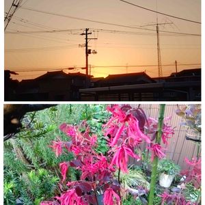 夜中の月とお天気下り坂の朝焼け⤵️ やっと見えた斑入りユキノシタの御所車。 ⛄が融けたら染井吉野の庭に植えようか……その前にソコの庭木の大移動かな😥