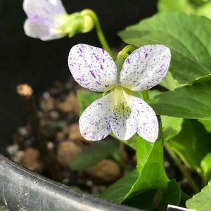 ベランダの片隅にひっそりと咲いたスミレ✨最初の花が今朝開きました。色々な種類のスミレを植えてきたけど、歯の形が細長いタイプが好きです。