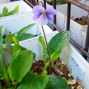 実生4年目で開花。 ノジスミレとフイリゲンジスミレの交配種です。 フイリゲンジスミレより収まりが良くなるんですね。