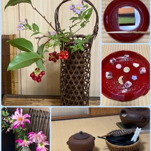 🏷午後お茶のおけいこ お花 サネカズラ、ノギク お菓子 もみじがり、干菓子 ↙️先生のお庭で咲いたダリア(お玄関)