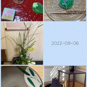 火曜午後はお茶🍵のお稽古❣️ お花:リンドウ、ヤブラン、タデ、 オミナエシ、ススキ ヤブミョウガ(全て先生の家のお庭にあります) お菓子:初萩 いつも楽しいお稽古 畑の🍠を持参の人、ゴーヤを持参の人 いつもお野菜たくさん頂き 夕食の一品に🎶 レシピ迄教えてもらってます✌️✌️✌️