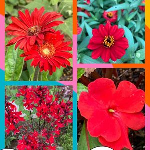 🏷赤い絆 参加します❤️❤️❤️❤️❤️ キュンキュン乙女倶楽部活動日 赤い花を愛でて 暑さに打ち勝つ🐘 ↖️から時計回り ガーベラ、ジニア、ニューギニアインパチェンス、宿根ロベリア