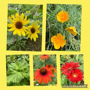🏷日曜ビタミンカラー 🏷ビューティフルサンデー 参加します💚💛❤️🧡 ひまわり、ハナビシソウ(こぼれ種の子まだ咲いてる)、宿根ガーベラ、エキナセア、大葉(こぼれ種の子) 左から時計回り‼️