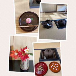 火曜日午後はお茶🍵のお稽古 お花 椿初嵐、もみじ🍁 お菓子 千代見草(菊の別名) 干菓子
