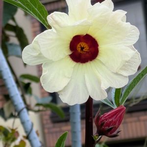昨年お店で切り花のローゼルかって種とって今年植えたら芽🌱が出てきたのよ🎵 6つ出てきたからお隣にお裾分けしたの🎵でも鉢だから軸が余り赤くなってないのよ😃 畑のは朱色になってるのにね❤️でも花さいて実がなってるよ😃今年も種とれるかなあ🎵✌(^_^)v