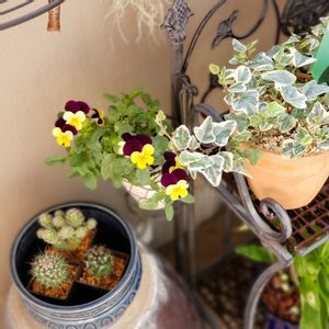 先月狩った、アイビー(ホワイトアン)も、家のベランダに馴染んできました。😃⤴️ ビオラは、シンプルな品種も可愛い❣️70円くらいで狩ったもの。😊