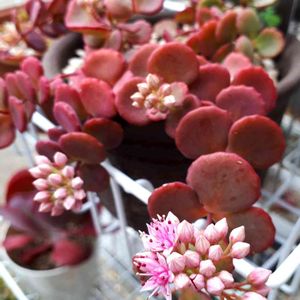 ミセバヤが真っ赤です❣️✨ 膨らんだ蕾が今日やっと数個咲いてくれました💠😊💓 左下↙️のデザートローズも真っ赤❣️✨ 家の真っ赤な多肉No.1とNo.2を競いあってます❣️😄