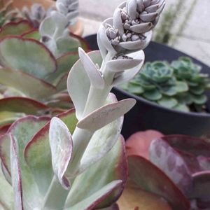薄氷さんの花芽が!💦 こんなに伸びてやっと咲きました💠💠😊💓 アートな感じ~✨ 後ろのデザートローズも真っ赤で可愛いです❣️