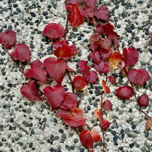ナツヅタ(夏蔦) ブドウ科 原産地 日本 小さなかわいい真っ赤な蔦を見つけました。🍁 巻髭の先に小さな吸盤を持っていて このように、蔵壁に這ってました。 😮 紅葉が終わると落葉🍂するのでしょうね。