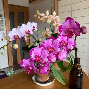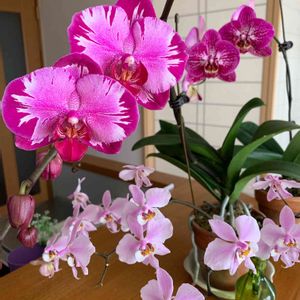 左から Phalaenopsis Champion Royal Masque 昨年10月半ばに小島舎さんから購入して、2回開花したファレノです。 Phalaenopsis Arakaki World Dream 'Okinawa' 昨年9月頭に新垣洋らん園さんのネットで購入し、うちに来てから葉が4から7枚に増えました。 本日やっと花芽を確認!これから寒くなる時期なので、暖かくして花を待ちます☺︎